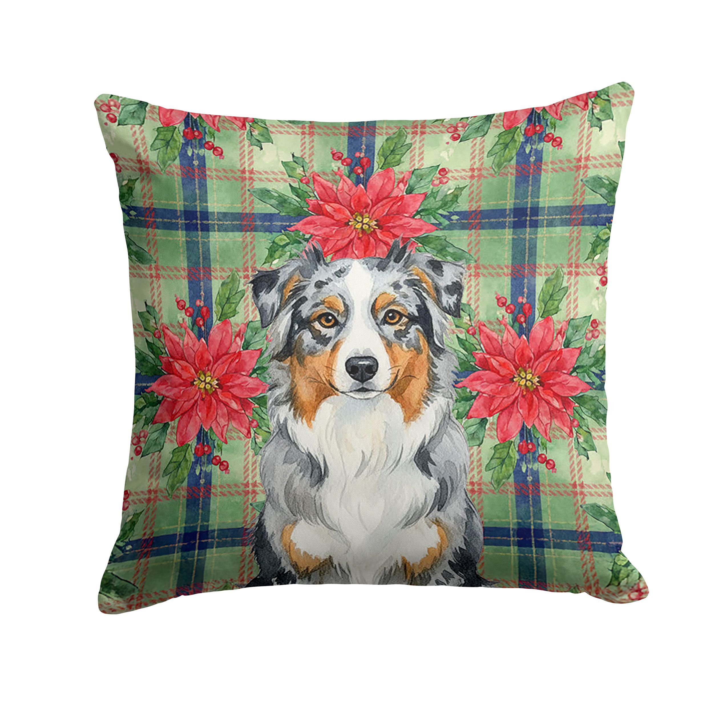 Throw Pillow featuring breed specific Australian Shepherd artwork. Celebrate Christmas with this Christmas Pillow. Add a touch of vibrancy and comfort to your outdoor seating with Caroline's Treasures Fabric Decorative Pillow. Measuring approximately 14 inches by 14 inches, this outdoor pillow is crafted to elevate the appeal of your patio furniture, infusing it with vivid color and artistic flair. The pillow includes a 100% Polyester Fabric sham filled with a quality pillow form to provide superior comfort. Innovatively made from our brand new material, specifically woven for its water resistance, this pillow is designed for durability. The soft canvas fabric offers versatility in use, fit for your indoor couch or your outdoor patio, porch, or veranda. The fabric is dyed with colorfast dyes built for resilience against weather conditions, ensuring the pillow retains its beauty over time. Constructed by sewing three fabric pieces to create a sham, the polyester insert is then nestled inside to form the pillow, resulting in an overstuffed pillow that maintains its shape. Both the sham and the pillow insert are proudly made in the United States. As the pillows are handcrafted, there may be minor variations in size, further enhancing their unique charm. Experience comfort in style with Caroline's Treasures Fabric Decorative Pillow.