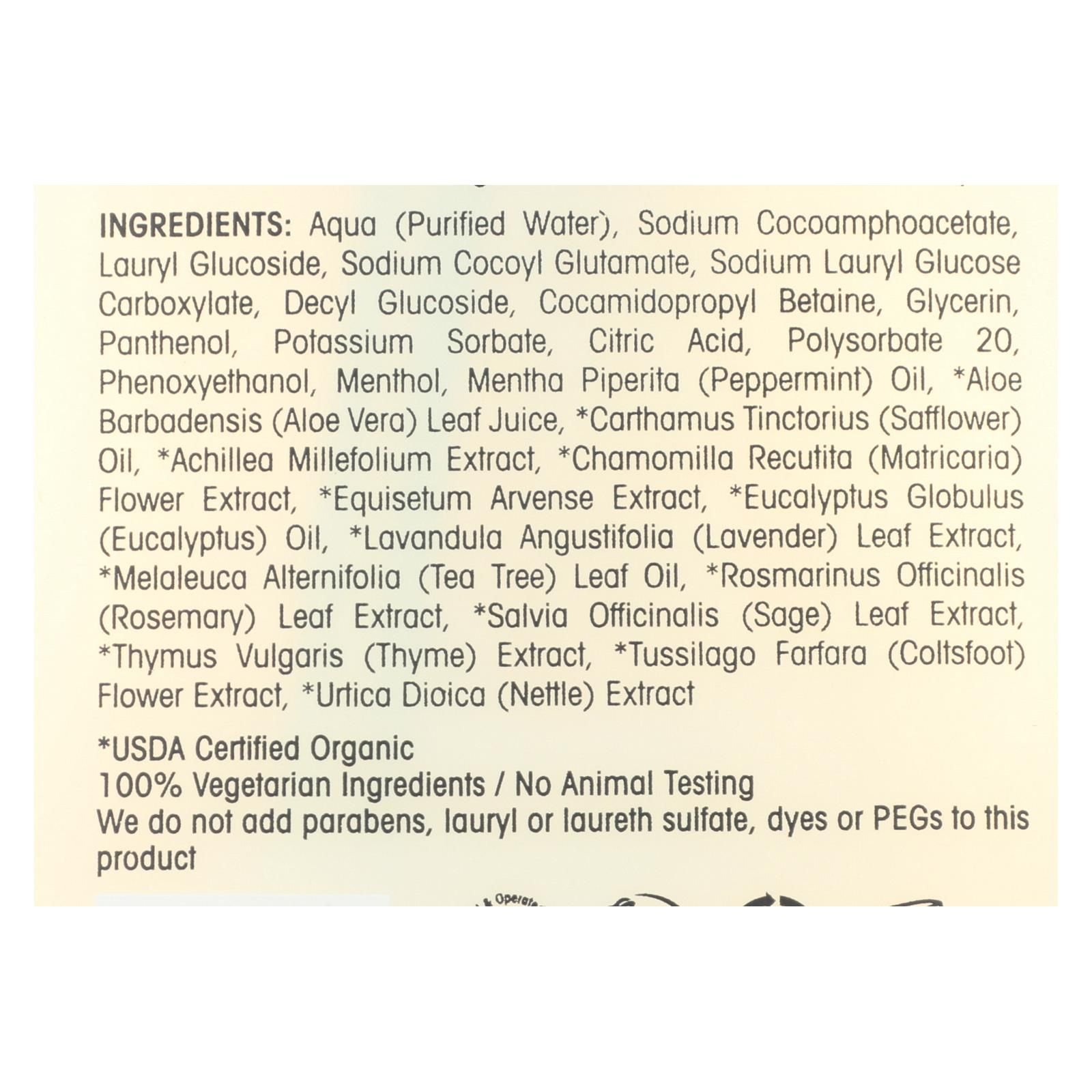 ingredients : aqua;purified water;sodium cocoamphoacetate;lauryl glucose;sodium cocoyl glutamate;sodium lauryl glucose carboxylate;decyl glucose;cocamidopropyl betaine;glycerin;panthenol;potassium sorbate;citric acid;polysorbate 20;phenoxyethanol;menthol;mentha piperita;peppermint;oil;aloe barbadensis;aloe vera;leaf juice;carthamus tinctorius;safflower;achillea millefolium extract;chamomilla recutita;matricaria;flower extract;equisetum arvense extract;eucalyptus globulus;eucalyptus;lavandula angustifolia;lave