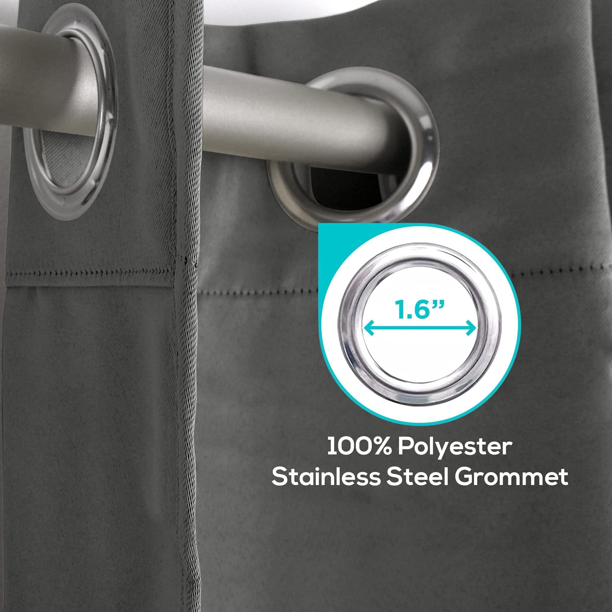 1.what's in the package? a set of 2 grey blackout curtain panels, each panel measures 42 inches the width and 84 inches the length. each curtain panel includes 6 silver metal grommet rings, each grommet inner diameter is 1.6 inch, which is compatible with most rods, and easy slides to install.